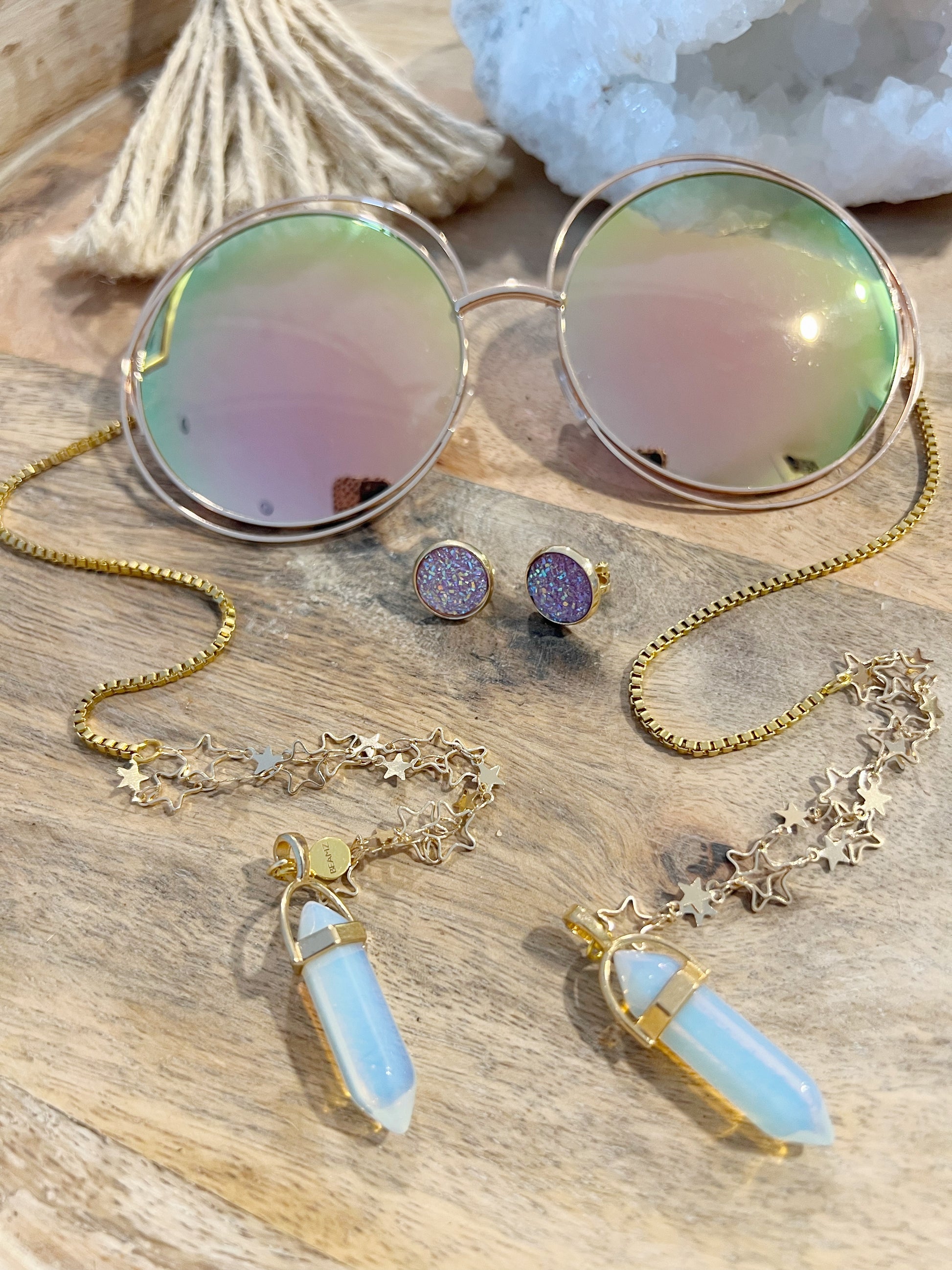 Uv400 protection chain arm sunglasses embellished with glass pendants. 70’s style sunglasses with star chain arms.